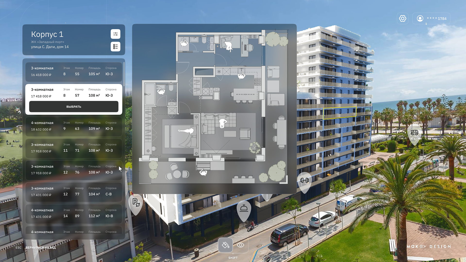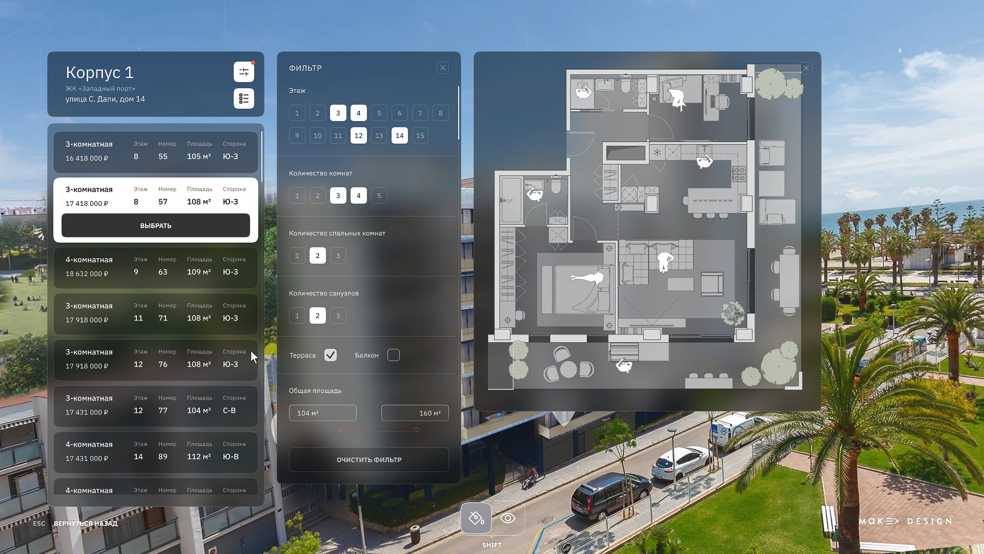 MakeDesign — профессиональная программа для 3D дизайна, которую Ваш менеджер по продажам освоит за 2 часа. В несколько кликов в режиме реального времени покупатель сможет прогуляться по ЖК, создать интерьер своей квартиры и получить точную смету с реальными материалами.