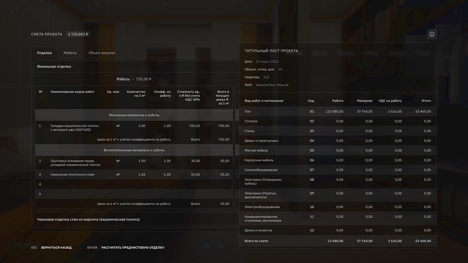 Получение детальной сметы с актуальными ценами в реальном времени.